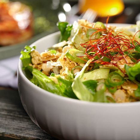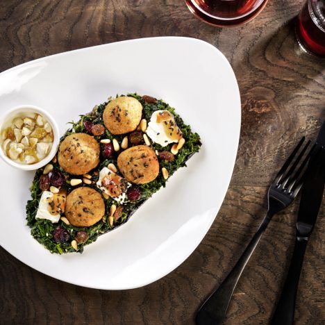 Aubergine „1001 Nacht“mit Falafelbällchen, dazu Spinat mit Cranberrys, Rosinen und Pinienkernen, Honig-Schafskäse sowie Joghurtcreme und Cashew-Crunch. Gemüse im Gewürzhimmel: Die gegrillte Aubergine ist verfeinert mit der edelsten aller orientalischen Gewürzmischungen, Ras el-Hanout.…